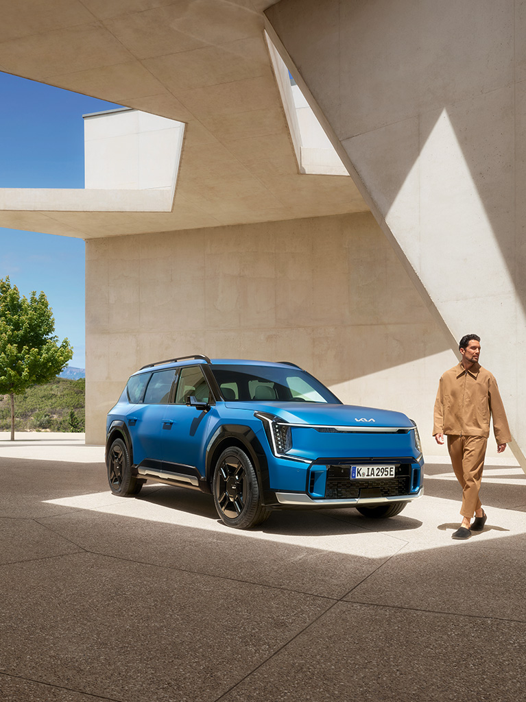 Wie der vielfach preisgekrönte EV6 (Europas Car of the Year 2022)  wurde der EV9 nach der neuen Kia-Designphilosophie „Opposites United“ (Vereinte Gegensätze) gestaltet. Inspiriert von der Natur und der Moderne, beeindruckt der EV9 durch ein unverwechselbares Profil in Verbindung mit einer futuristischen Linienführung. Aus jeder Perspektive einzigartig. Auf der Straße wie im Gelände.